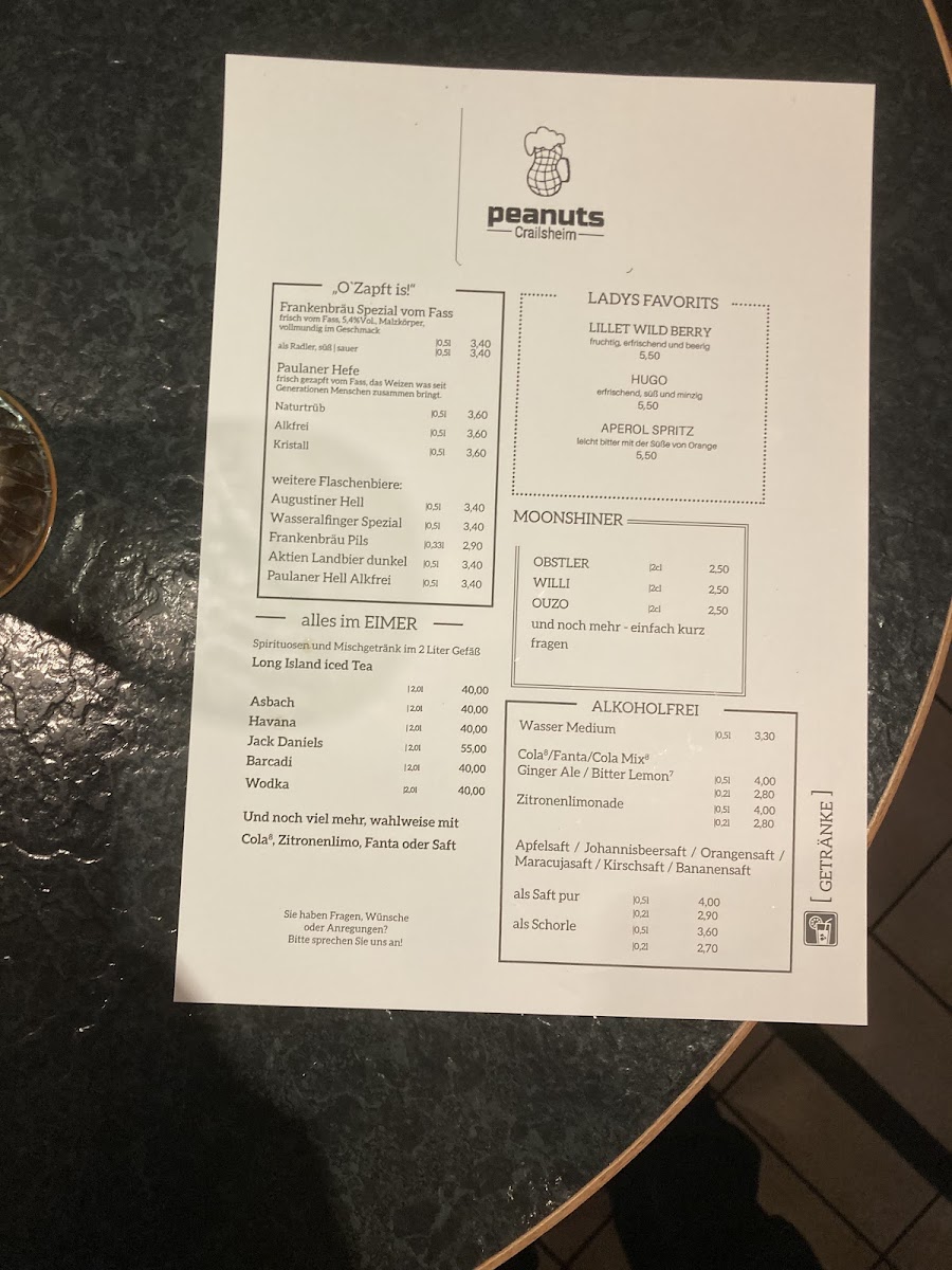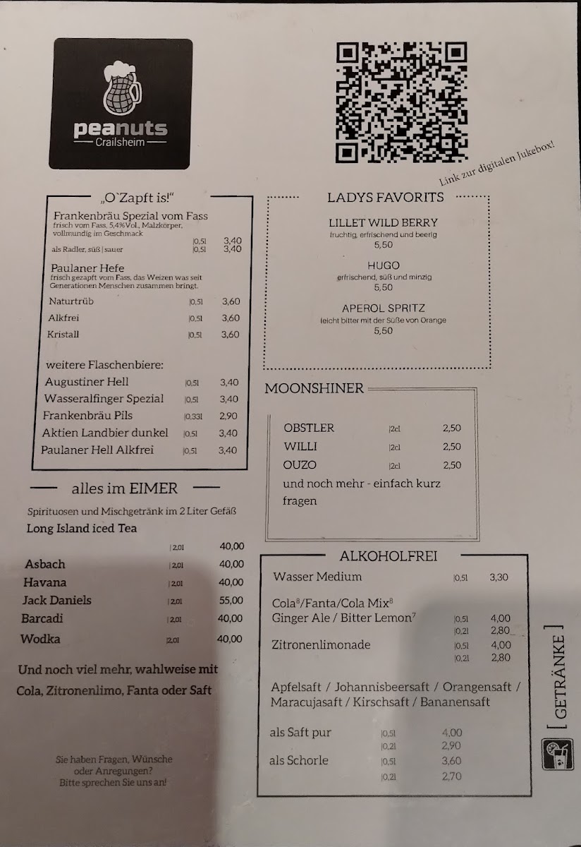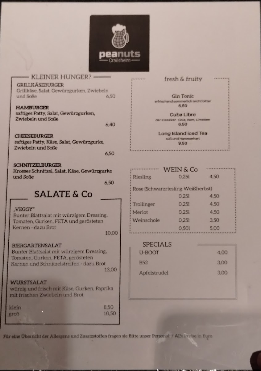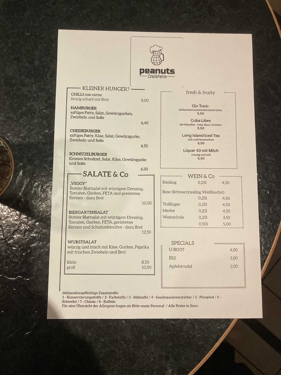 Viewed as a whole, the menu at Peanuts Crailsheim - Steinbruchweg 49 leaves a clear and confident impression rooted in hearty, traditional flavors and straightforward variety. The spotlight naturally falls on Wurstsalat Einsame Spitze, which feels like the kitchen’s signature expression of balance and character, offering a satisfying depth that sets the tone for the rest of the selection. Alongside it, the Salads category brings a lighter counterpoint, adding freshness and structure to the menu without straying from its rustic identity. The playful name Es Muss Nicht Immer Wurstsalat Sein reflects a welcome openness to choice, signaling that the menu is designed to please both devoted fans of classic sausage dishes and guests looking for something slightly different. For those who appreciate regional nuance, Schweizer Wurstsalat stands out with its distinct Swiss influence, delivering a familiar yet subtly refined variation that enriches the overall offering. Meanwhile, Großer Wurstsalat caters to heartier appetites, reinforcing the restaurant’s generous approach to portioning and value. Taken together, these highlighted dishes show a menu that is focused rather than overwhelming, consistent in quality, and clearly built around satisfying, well-executed staples that define the dining experience at Peanuts Crailsheim.
